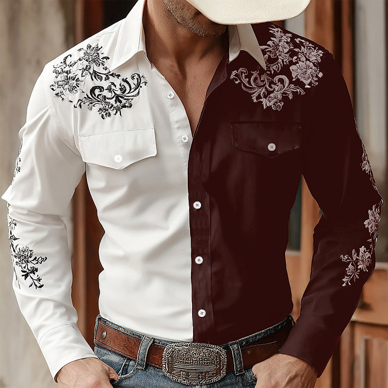 Men's Floral Print Ethnic Flowers Shirt Western Shirt Cowboy Shirt Long Sleeve Vintage Retro Outdoor Casual WorkWear Spring Fall Turndown Front Two Pockets Linen Like Shirt Button Up Shirts Light