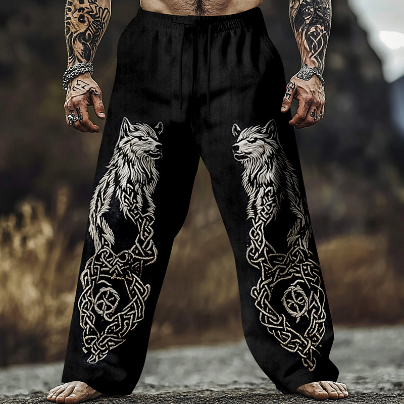 Men's Wolf Viking Celtic Art Trousers Baggy Pants Casual Pants Mid Waist Vintage Retro Outdoor Casual Elastic Drawstring Waist Linen-Like Pants with Pockets Spring Fall 3D Print Black Brown Green