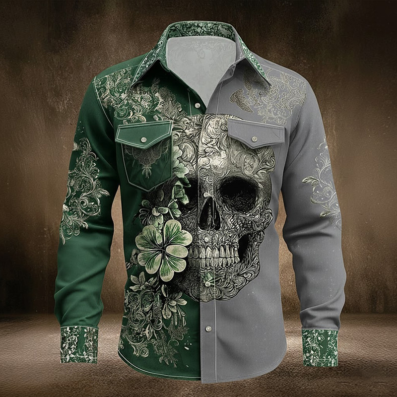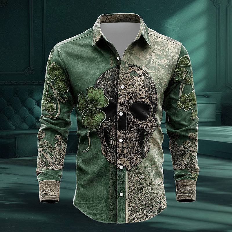 St. Patrick's Day Men's Skull Four Leaf Clover Shamrock Shirt Button Up Shirt Long Sleeve Vintage Retro Holiday Spring Fall Turndown 3D Print Linen Like Shirt Green 1# Green