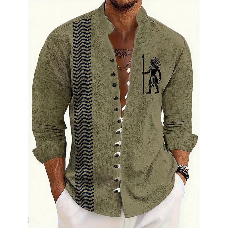 Men's Sun Ethnic Indian Culture Shirt Stand Collar Shirt Long Sleeve Vintage Retro Vacation Daily Wear Going out Spring Fall Mandarin Collar Band Collar Button-Down Linen Like Shirt Blue Dark Green