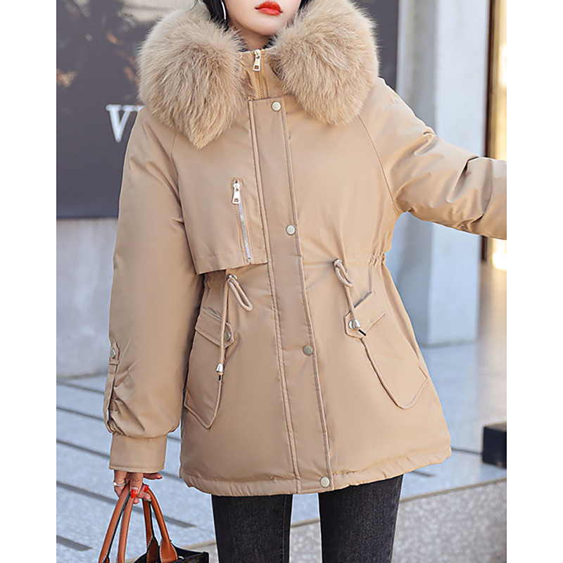 Women's Winter Coat Parka Warm Comfortable Fur Trim Zipper Pocket Fur Collar Casual Plain Vacation Street Casual Daily Wear Regular Hooded Regular Fit Long Sleeve Outerwear Black Blue Khaki Fall