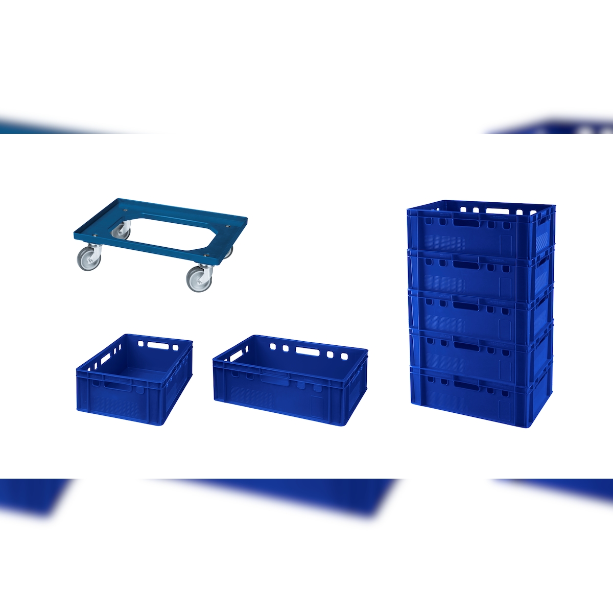 7 Stück E2-Kasten in Blau + 1 Transportroller mit vier Lenkrollen in Blau