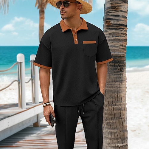 2-teiliges Herren-Sommer-Waffel-Polohemd Polo-Hose, passendes Set, Strandkleidung, Alltagskleidung, Ausgehkleidung, Kordelzug, schlicht, schwarz, weiß, königsblau, Sportbekleidung, Mode