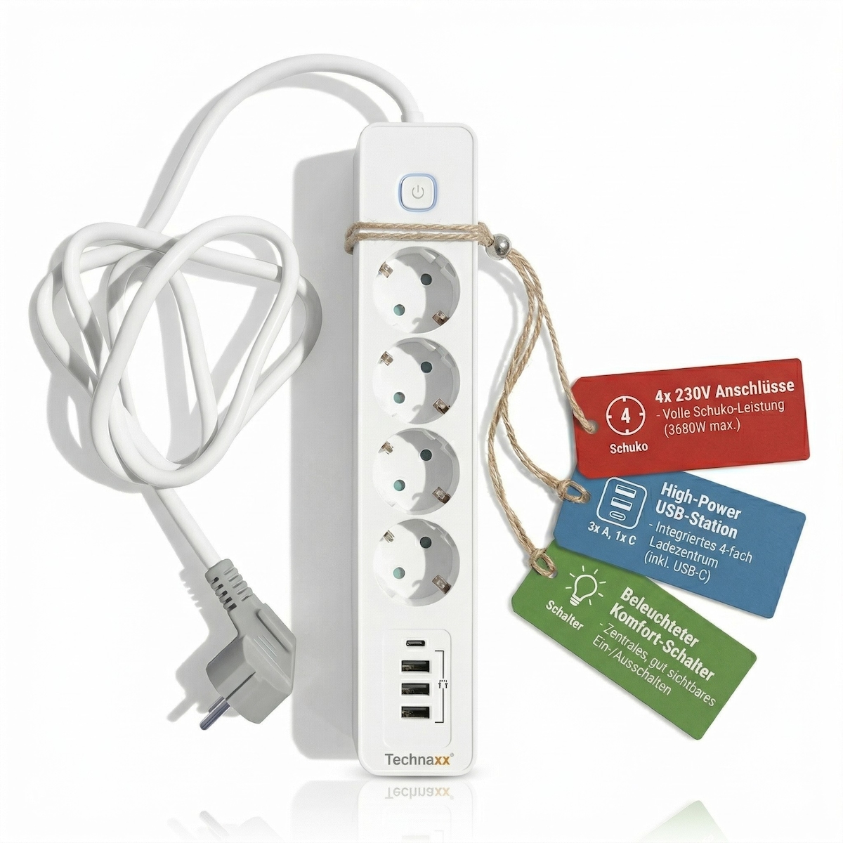 Technaxx 4-fach Steckdosenleiste 4x USB-Ports (1x USB-C) Schalter Kinderschutz