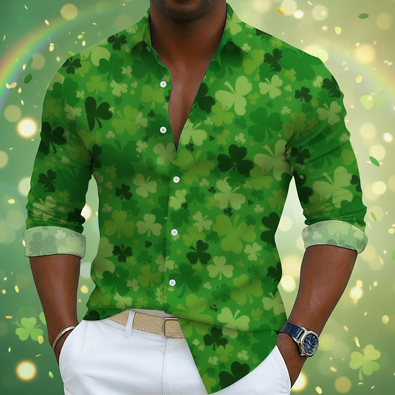 St. Patrick's Day Shirt for Men - Lucky Clover Shamrock 3D Print Long Sleeve Top with Lapel Collar Irish Graphic St. Paddy's Day Top