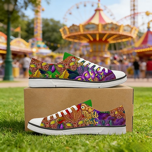 Damen-Sneaker aus Canvas mit Mardi-Gras-Konfetti-Print und Schnürung – stylische und bequeme Freizeitschuhe für Karnevalsumzüge, Ausflüge in den Vergnügungspark, Straßenfeste und sommerliche Alltagsbeschäftigungen