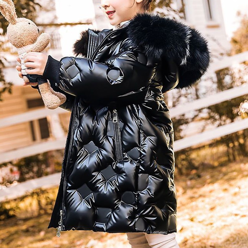 Kids Girls' Down Coat Solid Color Fashion Fur Trim Zipper Pocket School Coat Outerwear 4-12 Years Winter Black Pink Red