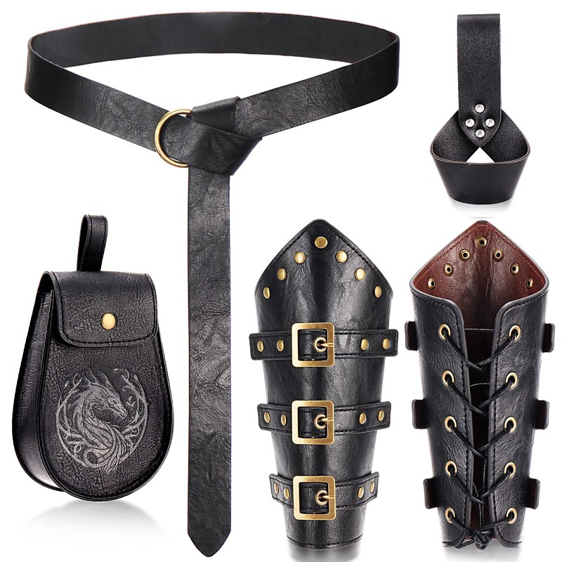 Set Medieval Renaissance Armor Waist Belt Accesories Set Warrior Viking Ranger Fancy Dress Men's 4 PCS Halloween Carnival Performance LARP Ren Faire Adults Bag Waist Belt Arm Guards All Seasons