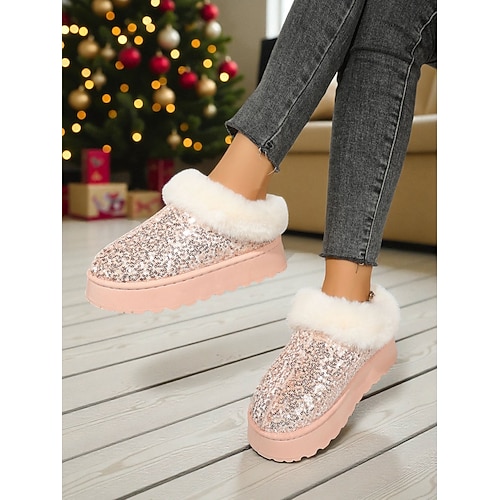 stivali da neve da donna con paillettes rosa e colletto in pelliccia sintetica: stivaletti invernali scintillanti alla moda per un comfort casual