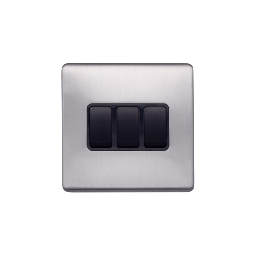 Lieber Brushed Chrome 10A 3 Gang 2 Way Switch - Black Insert Screwless - Size: 86mm x 86mm x 2 mm