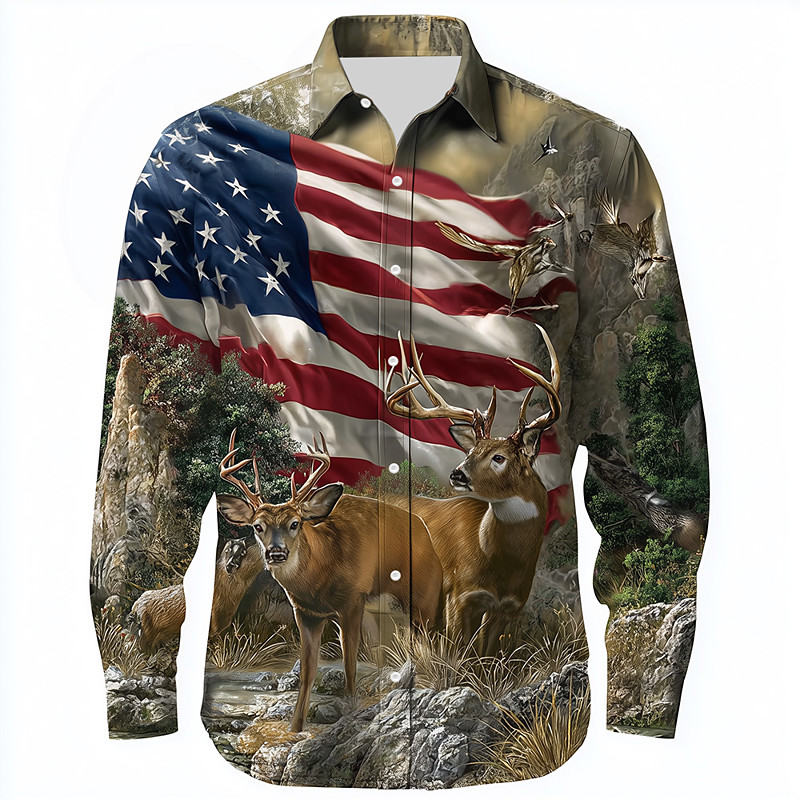 Men's Reindeer Camouflage US Flag Shirt Button Up Shirt Long Sleeve Vintage Retro Outdoor Camping Hiking Hunting Spring Fall Turndown 3D Print Linen Like Shirt Green 1# Green 2# Green