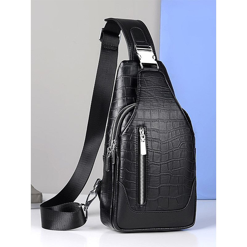 Men's Leather Sling Bag, Waterproof and Durable, Large Capacity, Stylish Crocodile Pattern for Outdoor and Daily Use