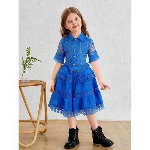 2 Pezzi Bambini Ragazze Tinta unica Pizzo Abiti eleganti Impostato Manica Corta Moda All'aperto Dai 4 anni in su Estate Blu Bianco Rosa
