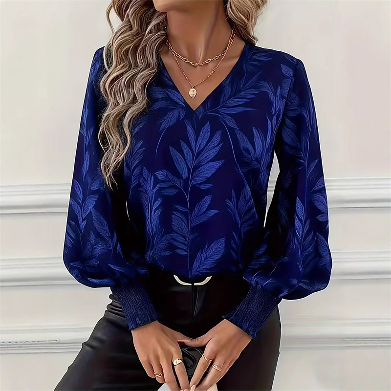 Women's Blouse Dressy Tops Leaf Plain Elegant Vintage Ladies Long Sleeve Puff Sleeve V Neck Regular Tops Daily Work Holiday Ruched Patchwork Print Blue Wine Purple Green Spring Fall