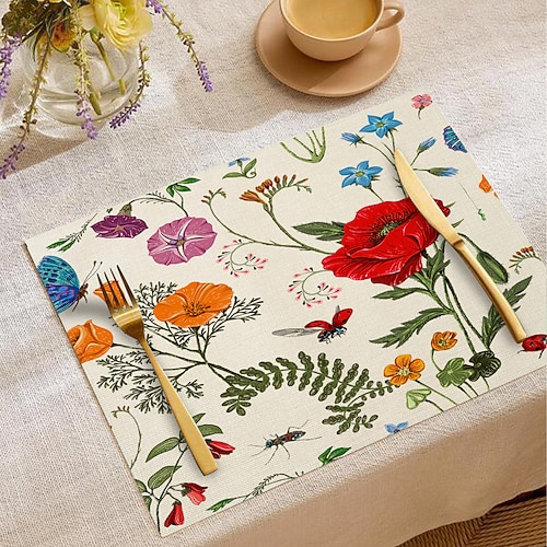 Tovaglietta da tavola in tessuto con motivo floreale e farfalle, 100% poliestere, rettangolare, con disegno di farfalle e piante verdi, lavabile in lavatrice, resistente e termoresistente.