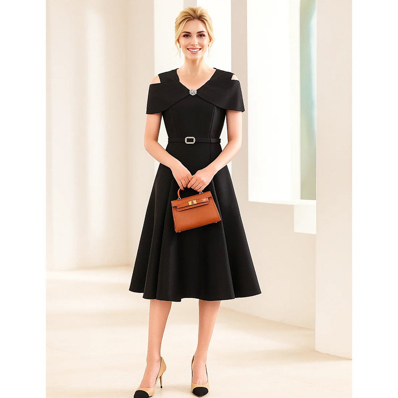 A-Line Ankle Length Knee Length Black Dress Party Dress Cocktail Dress Mother of the Bride Dress Short Sleeve Crew Neck V Neck Elegant Vintage Party Formal Satin with Pleats