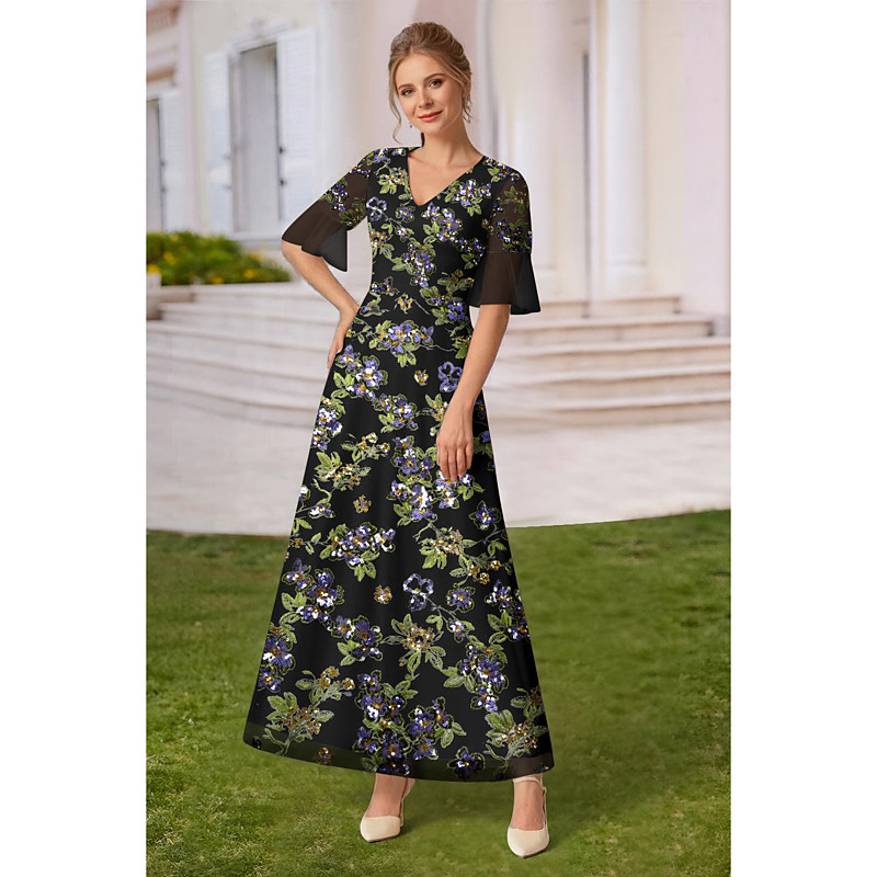 A-Line Dress Floor Length Wedding Guest Dress Formal Dresses Evening Gown Mother of the Bride Dress Short Sleeve V Neck Elegant Sparkle Shine Formal Chiffon Lace with Lace Sequin