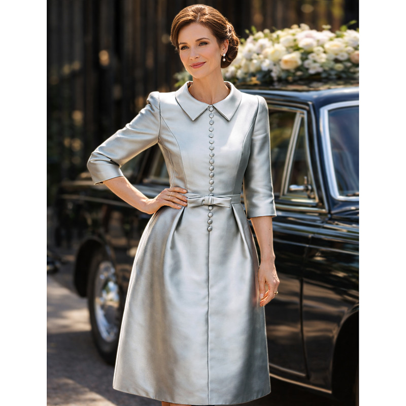 A-Line Tea Length Derby Dress Mother of the Bride Dress Long Sleeve Shirt Collar Elegant Vintage Simple Formal Kentucky Derby Taffeta with Bow(s)