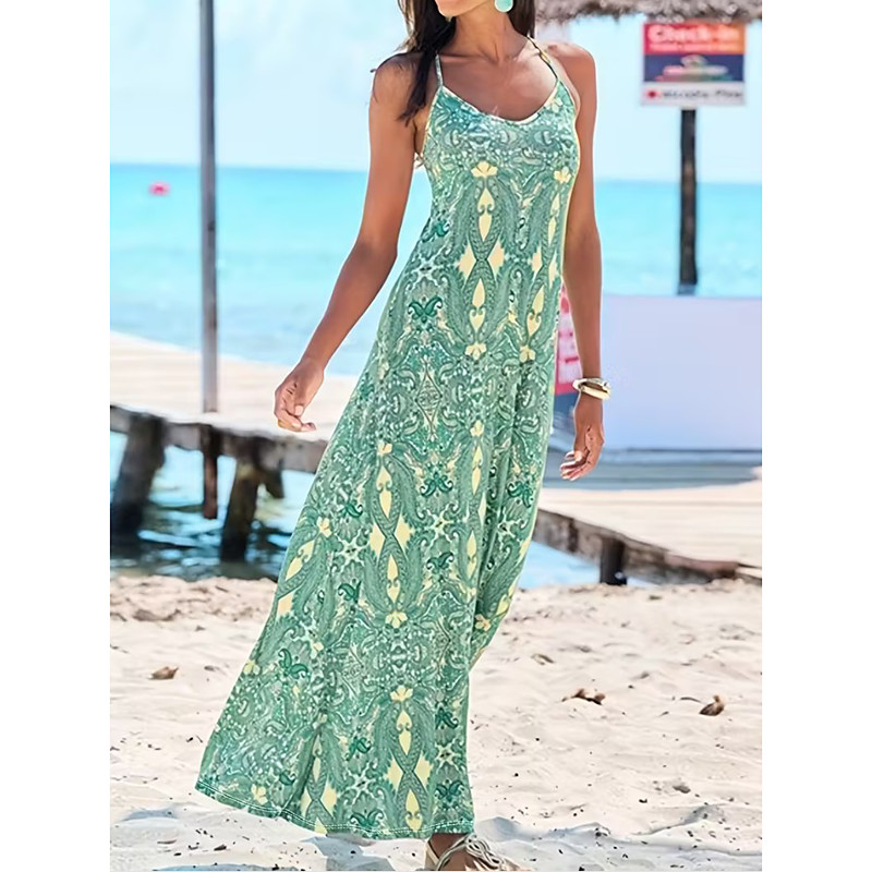 Women's Maxi Dress Sundress A Line Dress Slip Dress Vacation Casual Boho Beach Regular Fit Floral Graphic Abstract Sleeveless V Neck Light Green Summer Spring