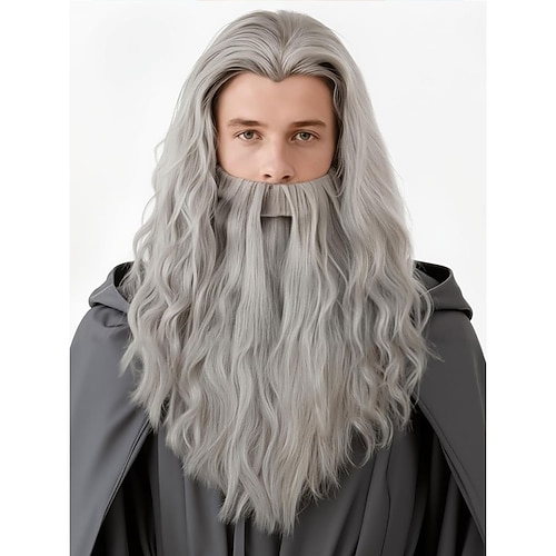 parrucca grigia lunga per uomo, set di parrucche e barba per cosplay di Halloween da Babbo Natale e mago
