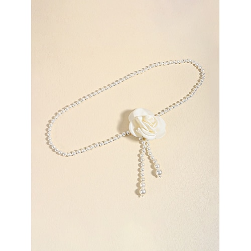 Collana da donna a catena con camelia e perle finte in bianco e nero, elegante e versatile, perfetta per matrimoni, feste serali, lavoro e occasioni formali.