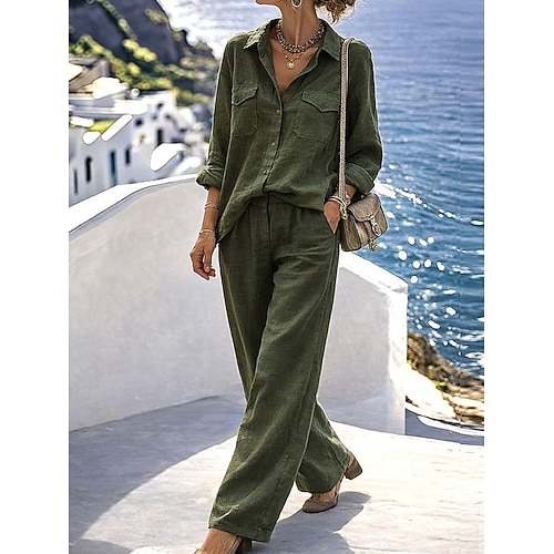 Per donna Set di biancheria in cotone Set di Pantaloni Bolero Top Manica Lunga Colletto a Camicia Tinta unica Moda Streetwear Casuale Quotidiano All'aperto Verde militare Estate Vestibilità comoda