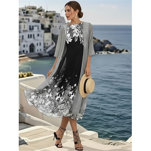Per donna Insieme del vestito Vestito in Chiffon Formale Floreale Stampato Abito maxi Mezza Manica Girocollo Feste Viola Grigio Estate Vestibilità comoda