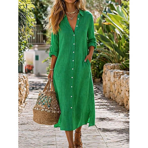 Per donna Abito Midi Abiti in cotone e lino Abito a Tubino Essenziale Quotidiano Vestibilità comoda Semplice Manica Lunga Colletto a Camicia Nero Bianco Marrone chiaro Arancione Estate Primavera