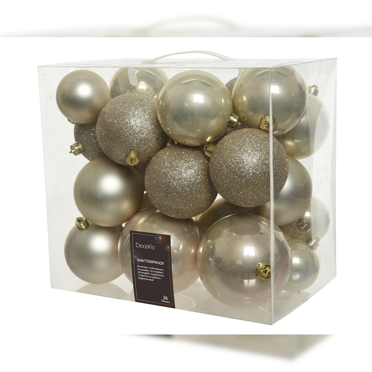 26 Weihnachtskugeln Kunststoff 6-10cm MixSet Christbaumkugeln Glitzer champagner