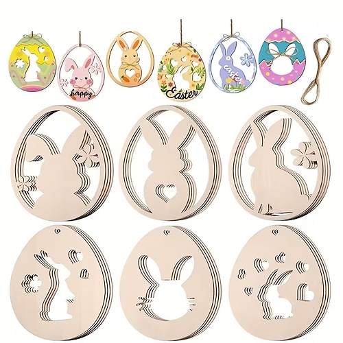 Confezione da 24 decorazioni pasquali in legno da dipingere con spago da 5 m, forme cave di conigli e uova per pittura fai da te, decorazioni per feste di compleanno, matrimoni, lavoretti da appendere