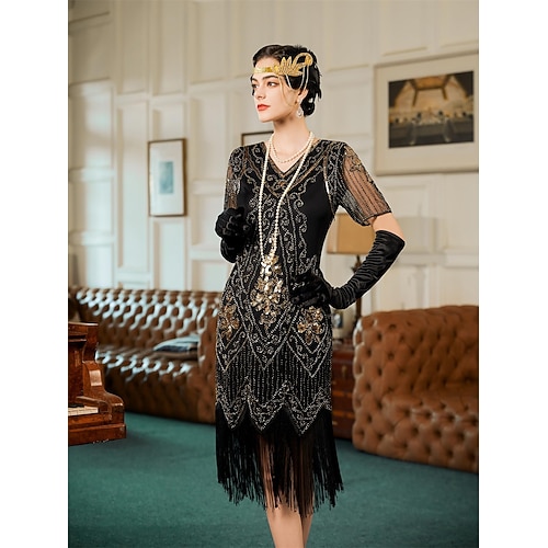 Retrò Vintage Anni Ruggenti Anni 1920 Lunghezza al ginocchio Abito Flapper Abiti Abito da cocktail Maniche corte Il grande Gatsby Invitato al matrimonio Paillettes Frangia con nappe Scollo a V Costume
