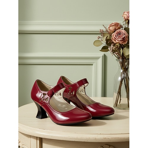 scarpe col tacco Mary Jane gialle vintage anni '20 da donna: décolleté con tacco ricurvo e ritagli, look classico in vernice per feste Gatsby, balli swing e occasioni speciali