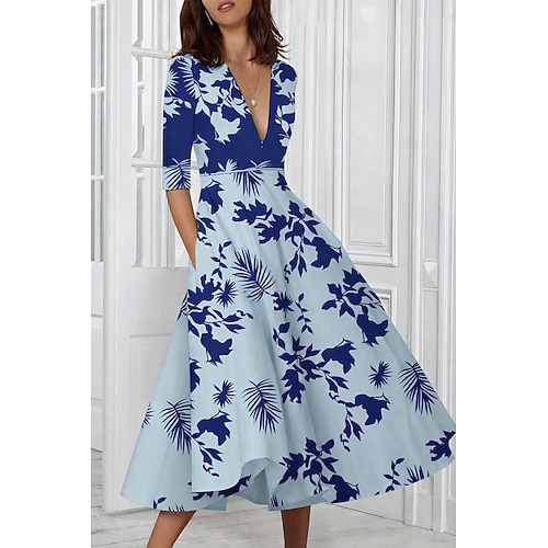 Linea ad A Lunghezza Tè Abiti da Cocktail Elegante Manica 3/4 Scollo a V Festa in giardino Matrimonio Raso con Stampa floreale