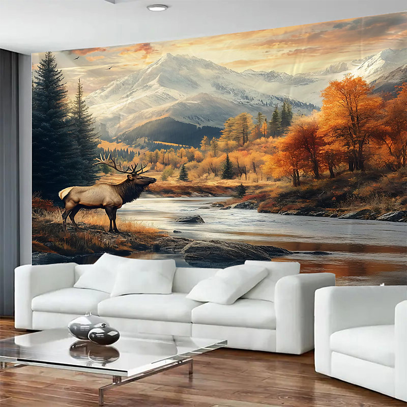 Large Autumn Forest Deer Animal Landscape Tapestry Wall Hanging Art Photography Background Blanket Curtain for Home Bedroom Living Room Decoration