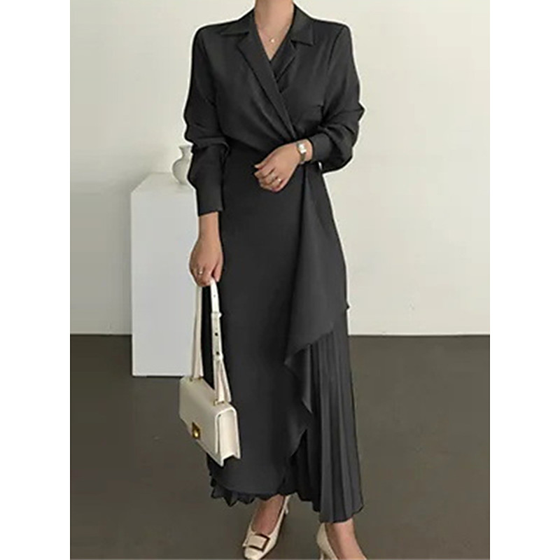 Women's Casual Dress Maxi long Dress Pleated Daily Elegant Fashion Shirt Collar Long Sleeve Black Brown Apricot Color