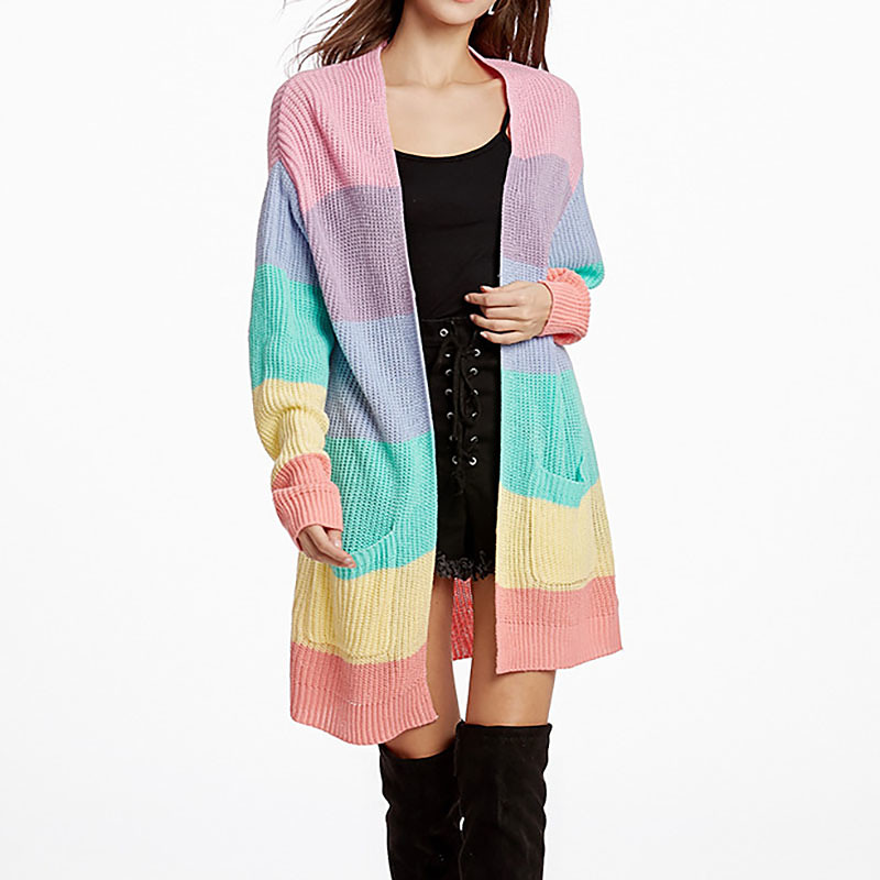Women's Sweater Cardigan Streetwear Casual Rainbow V Neck Open Front Pocket Knitted Long Sleeve Long Tops Knit Daily Holiday Going out Pink Fall Winter