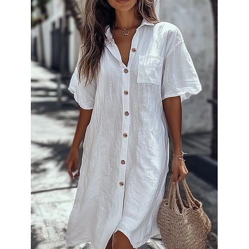 abito in cotone da donna, abito lungo fino al ginocchio, abito a trapezio, abito casual, moda, moderno, quotidiano, weekend, vestibilità ampia, semplice, manica corta, colletto camicia, blu, bianco,