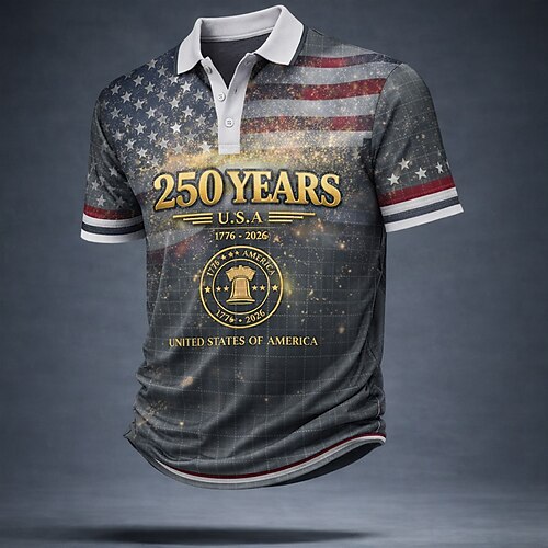 4. Juli 2026 250. Herren Amerikanische US-Flagge Poloshirts Kurzarm Polo-Shirts Hemden mit Kragen Lässig Outdoor Athleisure Knöpfe Frühling Sommer Blau Rote Grau