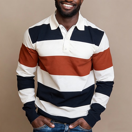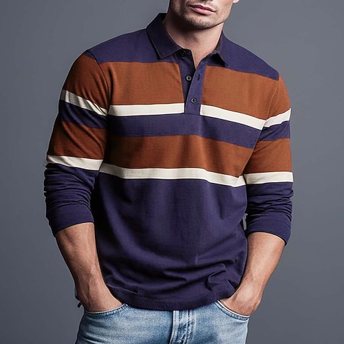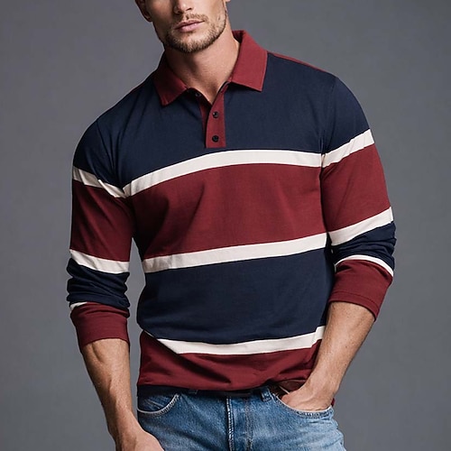 Herren Horizontale Streifen Rugby-Poloshirt Langarm Polo-Shirts Hemden mit Kragen Sportbekleidung Lässig Outdoor Schule Athleisure 3D-Druck Knöpfe Frühling Herbst Winter Blau Rote Braun