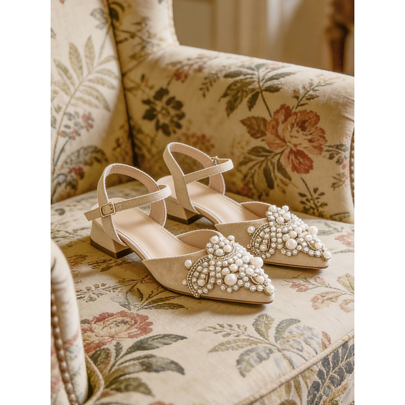 Women's Elegant Pearl-Embellished Flat Shoes with Ankle Strap – Stylish Suede Pointed-Toe Ballet Flats for Weddings, Formal Events and Everyday Wear