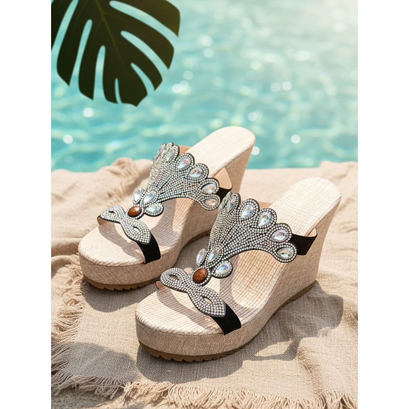 Women's Bohemia Rhinestone T-Strap Wedge Sandals with Pearl Gemstone Detailing – Perfect for Summer Vacations, Beach Parties Poolside