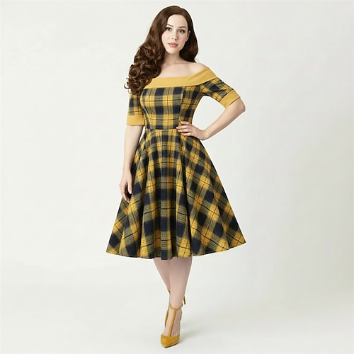 Retrò Vintage Anni 1950 Hepburn Midi Vestito Abito a trapezio Vestito Svasato Maniche corte Plaid Aderente Svasato Costume Per donna Carnevale San Valentino Casuale Ritorno a casa Festa a tema retrò
