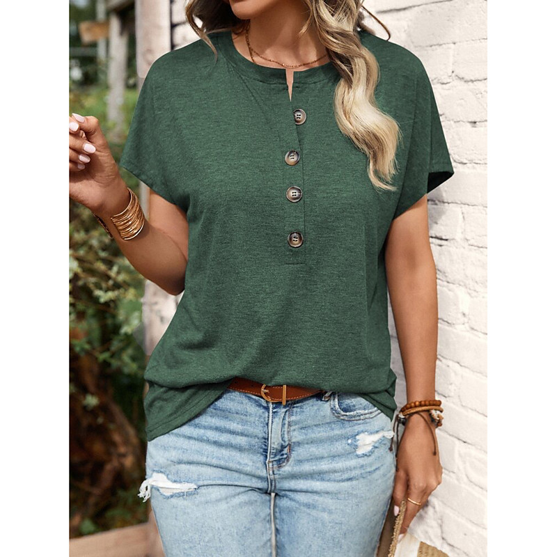 Women's T Shirt Plain Fashion Short Sleeve Round Neck Regular Tops Daily Weekend Buttons Black Pink Blue Brown Green Summer
