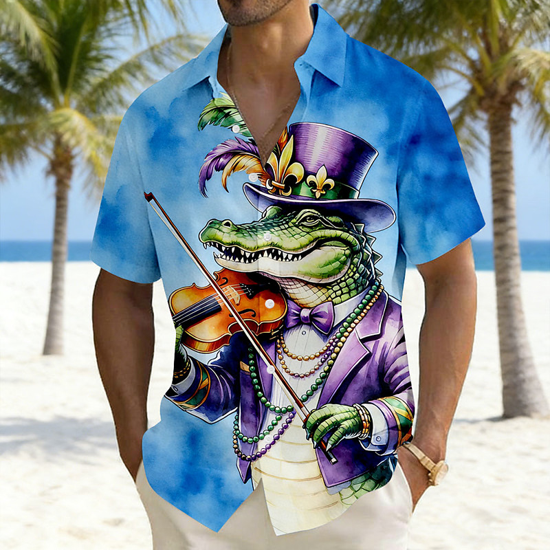 Mardi Gras Men's Crocodile Beads Mardi Gras Fleur De Lis Shirt Summer Shirt Button Up Shirt Short Sleeve Vintage Retro Holiday Summer Turndown 3D Print Linen Like Shirt Blue Purple Green