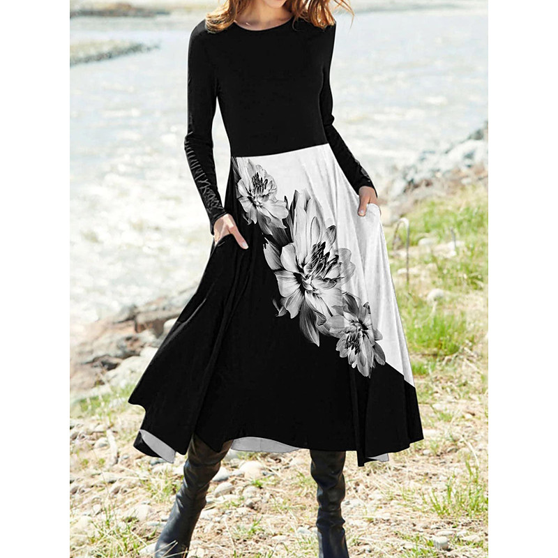 Women's Midi Dress A Line Dress Fit And Flare Dress Vacation Casual Daily Regular Fit Graphic Geometric Long Sleeve Crew Neck Black White Red Blue Summer Spring Fall Winter