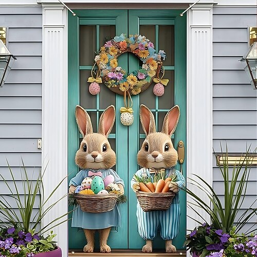 Copriporta pasquale con graziosi coniglietti che tengono uova e carote, decorazione primaverile festiva, perfetta per le celebrazioni pasquali e le decorazioni natalizie per porte