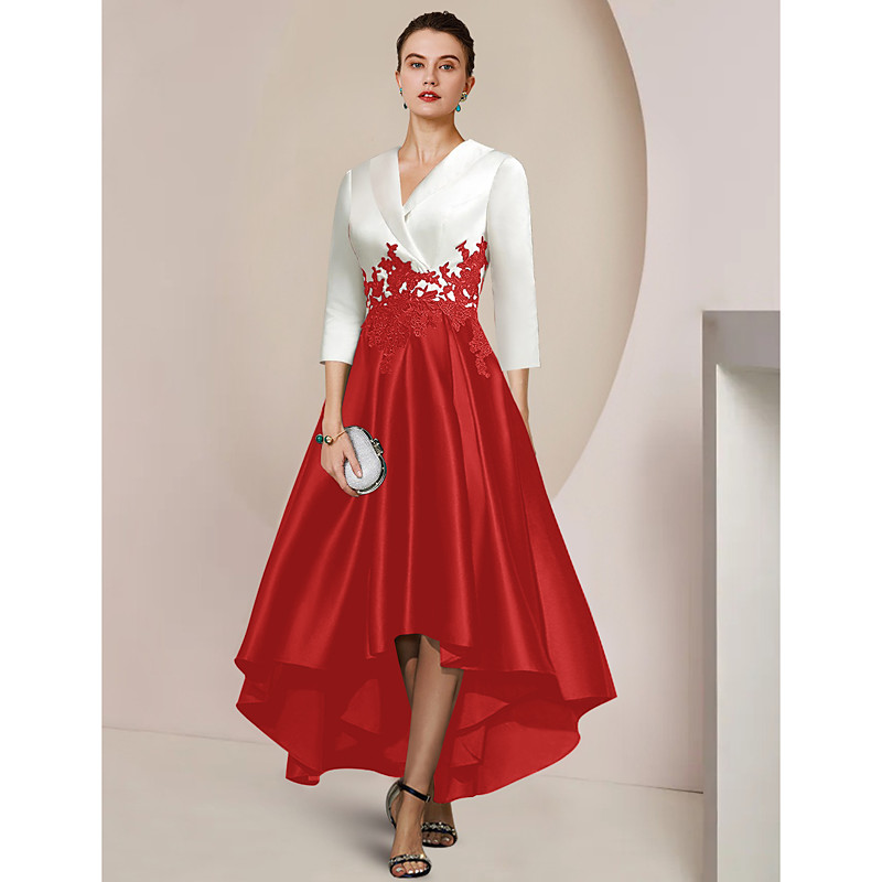 A-Line Asymmetrical Tea Length Party Dress Cocktail Dress Wedding Guest Dress Mother of the Bride Dress 3/4 Length Sleeve Shirt Collar Elegant High Low Formal Wedding Guest Satin Lace with Appliques