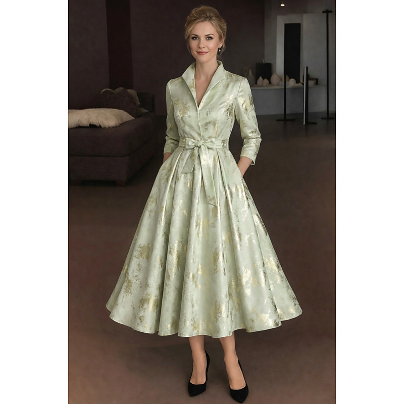 A-Line Tea Length Shirt Dress Formal Dresses Evening Gown Mother of the Bride Dress 3/4 Length Sleeve Shirt Collar Elegant Vintage Formal Jacquard with Sash / Ribbon Bow(s) Flower