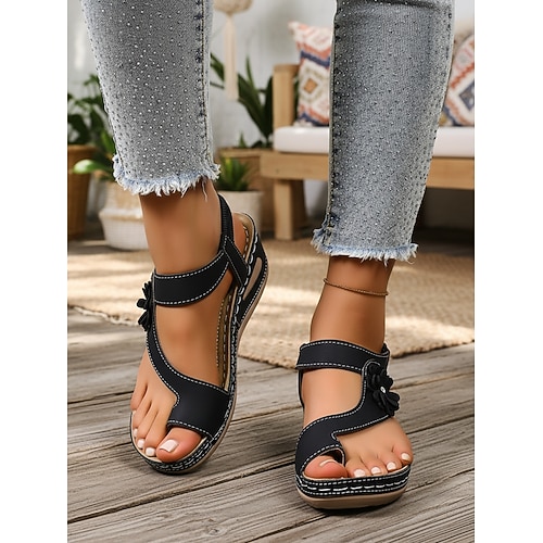 sandali da donna con dettagli floreali rossi, cinturino elasticizzato e comoda suola a zeppa, comode scarpe casual da indossare tutti i giorni, spiaggia, vacanza, passeggiate e attività all'aperto