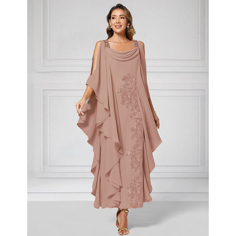 Sheath Column Ankle Length Party Dress Cocktail Dress Wedding Guest Dress Mother of the Bride Dress Half Sleeve Boat Neck Elegant Luxurious Sparkle Shine Wedding Guest Chiffon with Beading Tier